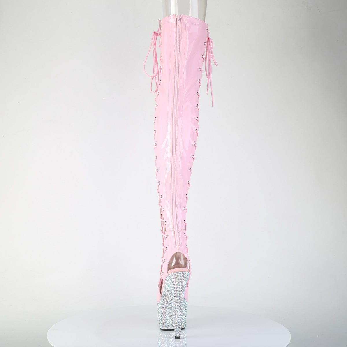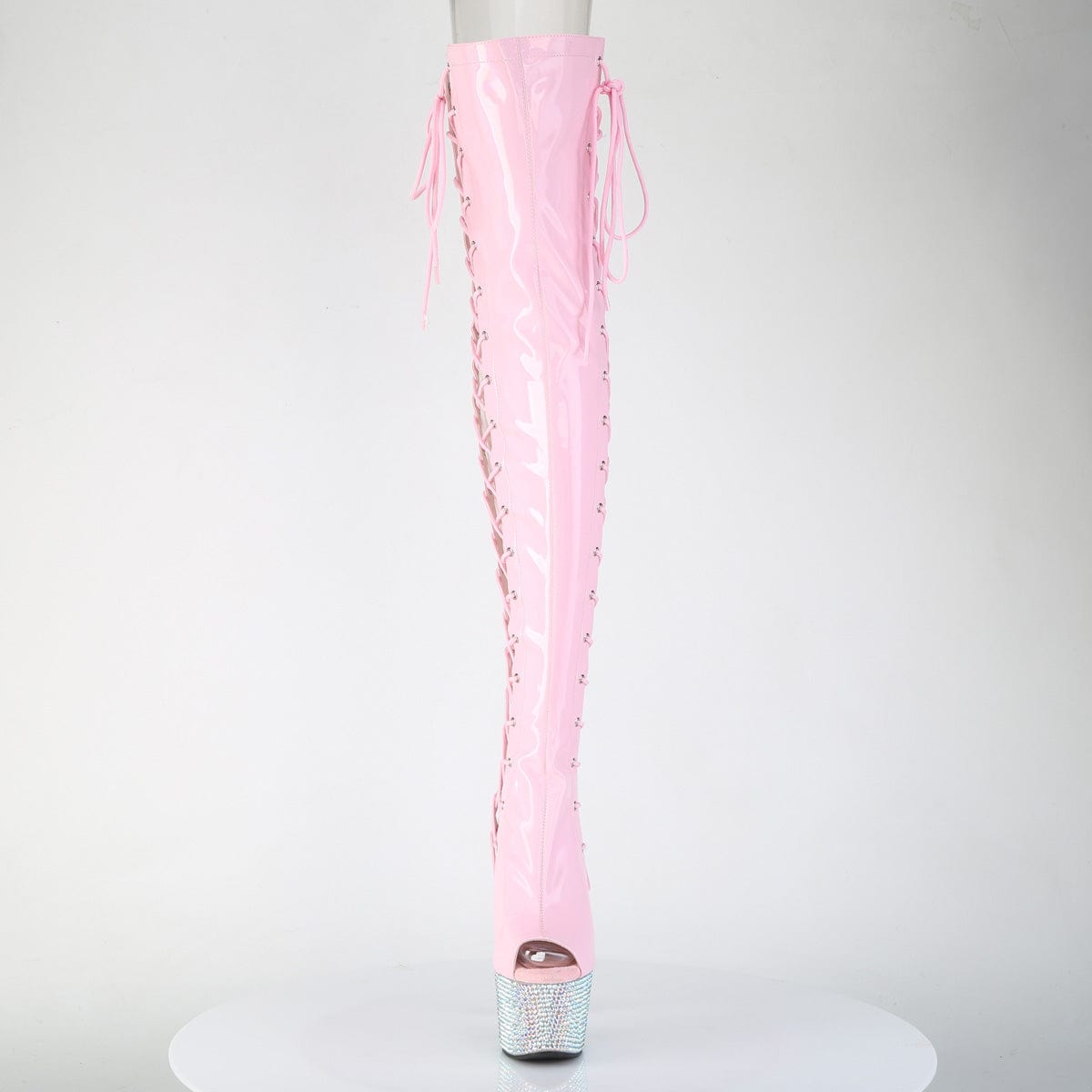 7 inch Heel, 2 3/4 inch Platform Open Toe/Back Side Lace Thigh Boot with Rhinestones